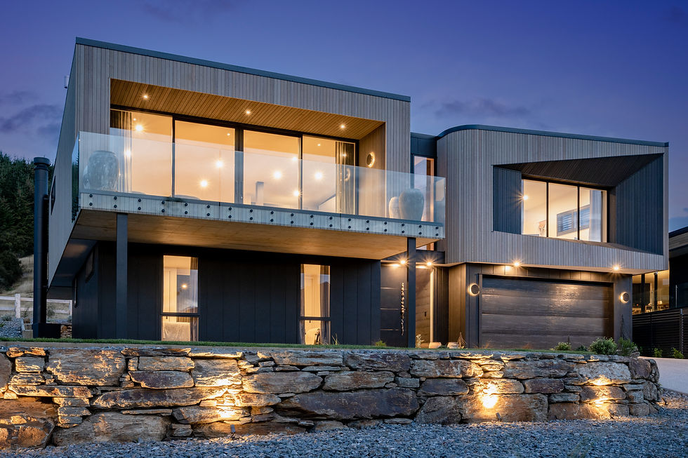 This two-level cedar-clad home blends into the alpine landscape, with expansive lake and mountain views. The upper-level living area opens to a northern deck with louvred decks, while the ground floor includes two bedrooms, a bathroom, laundry, garage, and a second living area leading to a covered patio.
